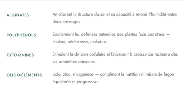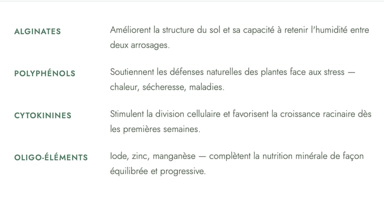 Les algues ne sont pas un engrais au sens classique du terme. Elles ne délivrent pas une dose massive de NPK. Ce qu'elles font est plus subtil et plus durable :