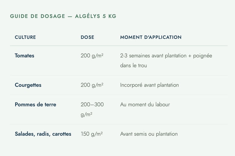 Incorporez Algélys au moment du labour ou de la préparation de la butte, à raison de 200 à 300 g/m². Les jardiniers qui l'utilisent régulièrement constatent une meilleure tenue des tubercules, moins de gale commune, et un feuillage qui reste vert plus longtemps en fin de saison.